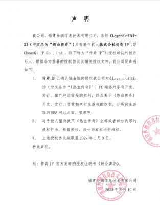 202308-16我公司,bwin·必赢信息技术有限公司,系经《Legend of Mir 2》(中文名为“热血传奇”)共有著作权人株式...
